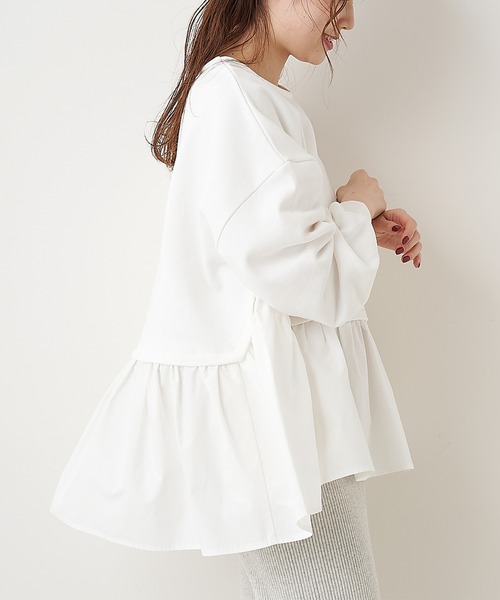 ピュアルセシン 2021 Spring collection 【Effortless garden】 ピュアルらしさでもある天然繊維の素材感、丁寧な生活の中に取り入れてほしい着心地 心弾むファッションを続けていけるように地球の恵みをテーマに変わりゆく時代にあったSSの提案 ◇WEB限定!スウェットを重ね着したようなデザイントップス◇ スウェットとシャツをレイヤードしたような重ね着風プルオーバー。 高めで切り替わったシャツ部分にはギャザーが入っているので ふんわりと広がるフェミニンなディテールです。 お尻を覆う着丈はお腹周りなど気になる部分をカバーしてくれます。 ボリューム感があるのでテーパードパンツやリブパンツなど、細身のボトムと相性抜群です。 ・こなれ感のある重ね着風プルオーバー ・ボリュームのある袖と切り替えブラウスがフェミニンなディテール ・フレアな切り替え部分が体型カバー◎ ・ワイドな身幅でラフな着心地 ・WEB限定アイテム =============================== 透け感:なし 裏地:なし 伸縮性:【カットソー部分】あり 【布帛部分】なし 光沢感:なし 生地の厚さ:普通 【スタッフコメント】 年齢:20代前半/身長:152cm/普段着用サイズ:Mサイズ サイズ感:ワイドな身幅にボリュームスリーブがラフな着心地です。ボリュームのあるシャツ部分か気になる部分をカバーしてくれます。 素材感:程よい厚みで伸縮性があります。裏パイルなので快適な着心地です。 =============================== ※撮影場所やお使いのモニター環境により若干お色味が異なる場合がございます。特にロケの撮影では明るく見える傾向にございます。 ※予約商品はサンプルで撮影をしております。若干の仕様が変更になる場合がございますので予めご了承の上ご注文くださいますようお願いいたします。