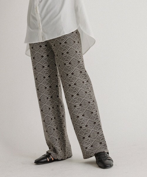 - 2021 VACANCY SPRING COLLECTION - ◆トレンドのジャガード柄をあしらったニットパンツ 【特徴】 ジャガード柄が目を惹く VACANCYイチオシのニットパンツが新登場! 別で販売中のジャガード柄ニットビスチェと 合わせるとセットアップでお洒落さんな印象に◎ 太すぎないワイドなシルエットと 程よい厚みのある生地感が レッグラインをすらっと綺麗に魅せてくれます。 ウエストはストレスフリーなゴム仕様で 今の時期おうちファッションを楽しむにも オススメしたいアイテムです♩ 【スタイリングポイント】 春にかけてシアーのワンピースや 丈の長いトップスと合わせて チラッとジャガード柄をのぞかせるスタイリングも◎ シャツやカットソーなど定番アイテムとの 相性も抜群なので、 様々なコーディネートにオススメです♩