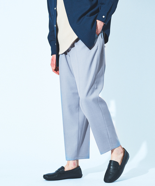 【素材】ポリエステルベースのストレッチ性のある素材を使用。適度な光沢と非常に柔らかな素材感で、伸縮性もありノンストレスな着心地です。シワもつきにくく洗濯もできるデイリーに使いやすいアイテム。【デザイン】腰回りにゆとりを持たせながら裾に向かってテーパードをかけました。立体的なパターンとテーパードシルエットで脚を細く、長く見せてくれる一本。ワンポイントでDカン付。大人な雰囲気漂うネイビー、トレンドのベージュ、そしてくすみ感が絶妙なサックス、グレージュの4色展開。【コーディネート】飾らないシンプルなデザインなのでコーディネートへの取り入れやすさ抜群。同素材コート(71420000000)、ジャケット(71420080000)、ブルゾン(71420030002)、シャツ(71420010001)とあわせたセットアップスタイルがオススメ。