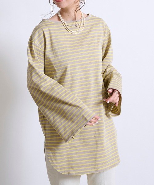 \1枚でサマになるボーダーカットソー/ 取り入れるだけで、着映えするボーダーカットソーは必ず1枚持っておきたいアイテム。ややワイドなお袖のデザインと、気になるラインをしっかりとカバーしてくれるゆとりのあるシルエットがポイント。襟ぐりはボートネックデザインの為、女性らしさも◎ 無造作にお袖を捲って抜け感を出した着こなしがおすすめです。スタンダードなアイテムなので、スカート・パンツどちらともマッチしてくれます。また、裾のラウンドヘムを活かしたレイヤードコーデにも大活躍♪ハリのあるしっかりとした素材は、コットン100%でおうちでのお手入れも楽々。デイリー使いにオススメの1枚です。 ********************* ・ぱっと目を惹くボーダー柄 ・身体のラインを拾わないシルエット ・女性らしさを垣間見せるボートネックデザイン ********************* 【 ♡ をクリックでお得な情報をお知らせいたします 】 〈 商品のお気に入り登録 〉 お気に入りアイテムのお値下げ・再入荷・在庫ラスト1点など通知を受けることができます。 〈 ブランドのお気に入り登録 〉 DOUDOUの新商品や再入荷、セール、クーポン配布などお得な情報を受けることができます。 -------------------------------------- ※ 掲載画像の商品の色味は、 撮影場所や光の当たり具合などにより色味が異なって見える場合がございます。 また、お客様のお使いのPC・スマートフォン等のモニター環境などにより色味が異なって見える場合がございます。予めご了承の上ご注文ください。 ※着用、お取り扱いの際は、商品についている品質表示とアテンションタグを必ずご確認下さい。