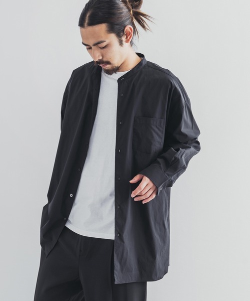 拘り抜いた素材からパターンとサイジングで仕上げた、バンドカラー長袖ボクシーシャツ。AラインのBOXシルエットを重点に、品良く着用できるよう計算されたサイズバランス。撥水、撥油性に優れ汚れにくく、染み込んだ汚れも洗濯で落ちやすくなっている機能素材です。■ "BOX-A Line" Collection90年代に生産されていた名品(Big Shirts)をモデリングし、1からパターン作製。この名品は当時販売されていたレギュラーサイズよりも、大きめに着ることを前提にしたモデルで、日本では販売されることもなく、時が経った今でも、古着市場で手に入りづらい希少価値の高いモデル。大体のサイズ感ですが、MサイズでレギュラーサイズのXLサイズぐらいを想定しています。レギュラーサイズのXLを着ると袖丈や着丈が異常に長くなってしまい、どうしても野暮ったくなってしまいます。そこでAラインのBOXシルエットを重点に、大人の方でも品良く着用できるよう計算したサイズバランスで仕上げました。■ 60sビンテージITARY NAVYをモチーフにクラシックな要素の強いデタッチャブルカラーをバンドカラーにし、衿の高さを低めに設定。襟が小ぶりで、両脇にガゼット(マチ)が付いているのが60年代のシャツの大まかな特徴。マチのアクセントが効いていて、パンツの太さを選ばない、優等生モデルです。50年代フランス軍医療部隊 S.S.A 39(Service de sant desarmes) で使用されていたシャツにも通じる形です。クラフツマンシップ溢れる「折伏せ縫い」で裏側まで綺麗に仕上げています。前立てが表側に出ない裏前立てにすることで、よりドレッシーにビジネスカジュアルとしてもご着用いただけます。■ 70/30クロス ストレッチタイプライター綿の柔らかさ、優しさとポリエステルの強さ・ハリコシ感、撥水撥油機能を持たせたストレッチタイプライター。撥水、撥油性に優れ汚れにくく、染み込んだ汚れも洗濯で落ちやすくなっている機能素材です。シャツと言えば白ですが、汚れが目立つ、気に入って着用すればするほど黄ばみが発生してしまう、などの理由で敬遠されていた方にはオススメの素材です。また、吸湿性、透湿性は従来の綿素材と変わりません。速乾性、耐久性にも優れているため、どうしても部屋干しになってしまう梅雨の時期でも、気兼ねなくたくさんご着用いただけます。ストレッチも効いて着心地快適です。■ Made in JAPAN厳選された素材だけが使用され、職人による丁寧なものづくりからできたスペシャルな1枚です。安心・高品質なのはもちろん、定番使いできる物だからこそ、満足できる仕上がりになっています。【Upscape Audience/アップスケープオーディエンス】人気ブランド「Audience」の国産ラインブランドである「Upscape Audience」日本製ならではの美しい仕上げとこだわりのデザインは、さり気なくも確実にセンスの良さを際立たせます。高品質な日本製ならではの品質をぜひお楽しみ下さい。=スタッフ着用コメント=・モデル KENTARO:身長186cm / 体重63kg着用サイズ:L着丈:太ももが半分隠れるぐらいで、丁度良いゆるさでした。肩幅:広めに取られているのでざっくりしたシルエットになりました。身幅:程良くゆとりがあり、羽織りとしても活躍しそうです。・スタッフA:身長165cm / 体重52kg / 普段S-M着用着用サイズ:M着丈:太ももが隠れるぐらいの丈感で、ロングに着られました。肩幅:しっかりと肩が落ちているので、とても楽に着られました。身幅:かなり余裕がありましたが、シルエットはきれいでした。・スタッフB:身長175cm / 体重65kg / 普段M-L着用着用サイズ:L着丈:お尻がすっぽり隠れる長さで、とても動きやすかったです。肩幅:窮屈感はなく、リラックスして着られました。身幅:程良いAラインで、様々なボトムスに合わせやすいです。【お買い物をお楽しみいただく為に!】▼商品のお気に入り登録完売カラーの再入荷通知や、ラスト1点の通知、セールの通知も受け取ることができます。▼ブランドのお気に入り登録新商品や再入荷等、いち早くブランドのお得な情報を受け取ることができます!