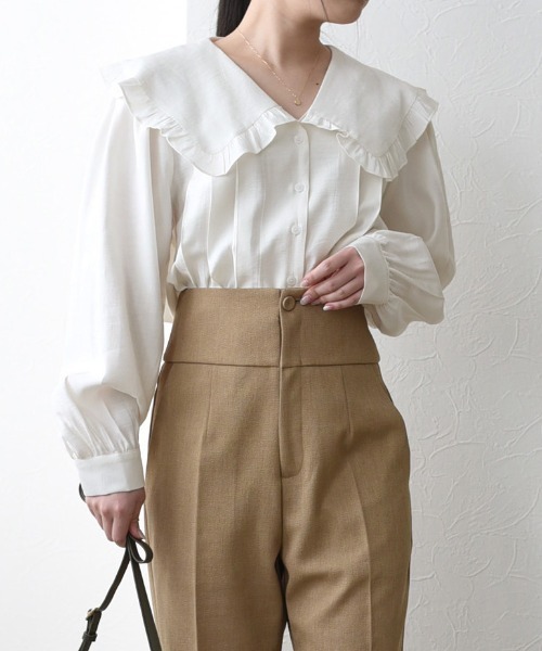 2021 2nd Spring Collectionお問い合わせ多数いただいておりました、フリルカラーブラウス。 コットン素材ではなくレーヨン・ポリエステル素材でしなやかなのがおすすめポイント。 柔らかで少しとろみのある素材感が、さらっとしていて着用しててもが気持ちよく、ストレスフリー。 大きな衿が上品で、衿ぐりもVあきになっており、ちょっとした肌見せが女性らしい印象に。 ジャンスカや、サロペットのインナーや、デニム、ワイド、テーパードパンツ、どの形とも相性がいいデザインブラウスです。※画像の商品はサンプルです。実際の商品と仕様や加工、サイズが若干異なる場合がございます。※撮影場所やイメージにより、実際の商品と色味が若干異なる場合がございます。※サイズに若干の個体差が生じる場合がございます。予めご了承下さい。【オススメの機能について】《商品のお気に入り登録》により、完売カラーの再入荷通知、ラスト1点の通知、セールの通知も受け取ることができます!《ブランドのお気に入り登録》により、新商品や再入荷など、イチ早くブランドのお得なセールやクーポン配布などの情報を受け取ることができます!お得な情報をGETして頂く為にも、是非ご活用くださいませ