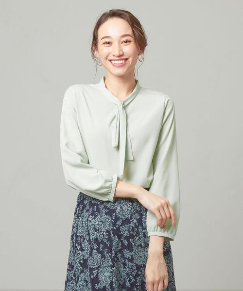 さらりとした薄手の素材に淡い色合いが、これからのシーズンに活躍するブラウス。折り返したようなスタンドデザインからリボンのようなタイを華やかに添え、さりげなくパール調のボタンをあしらった上品な一枚。フロントのデザインが引き立つようすっきりとした身頃に、ふんわりと立体的なスリーブが女性らしさを演出します。一枚着として存在感を放ちつつ、インナー使いとしても優秀で根強い人気のアイテムです。____________________透け感:ややあり伸縮性:なし裏地:なし_____________________<closet story>フレンチシックとブリットモダンがテーマのオリジナル企画レーベル。若々しさと可愛らしさをもったエレガントなスタイルをベースに、都会的で今日を生きる女性が「自分らしさ」を大切にしたいときに揃えたいアイテムを提案します。店舗へお問い合わせの際は、全国のTHE STATION STORE各店舗まで下記の品番をお申し付け下さい。品番:6911-699-0346