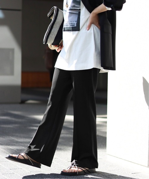 【2021 SS】JOURNAL STANDARDイージーケアなポリエステル素材のポンチを使った、とにかく便利な美脚ボトムが登場◎ ほんのりフレアで脚を美しく見せてくれ、ウエストゴムのカットソーボトムなので履き心地も良く、履いていてストレスがありません。カットソーパンツというとリブパンツが定番ですが、こちらはリブ目がなくよりクリーンに見え、体のラインも拾いづらい嬉しいポイントが満載のパンツ。ポリエステル素材の特性上、美脚効果のあるセンタープレスが洗濯しても消えないのが嬉しいポイントです◎セレモニーでの着用もおすすめです。**********************透け感:なし裏地:なし伸縮性:あり光沢感:なし生地の厚さ:普通**********************【スタッフ着用コメント】《スタッフO》年齢:30代前半/身長:158cm/体型:普通/普段サイズ:M/着用サイズ:FREEサイズ感:足のラインを拾わずきれいなシルエットで履けます。素材感:ポンチ素材で程よいカジュアルさのある素材。ONOFFで使える素材です。着心地:ストレッチが効いていてウエストのしめつけもなくリラックスして履けます。**********************※取り扱いについては、商品についている品質表示でご確認ください。※店頭及び屋外での撮影画像は、光の当たり具合で色味が違って見える場合があります。商品の色味はスタジオ撮影の画像をご参照下さい。洗濯:洗濯機使用可
