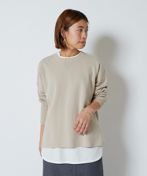 【知性のあるたたずまい】ゆったりシルエットに優しいカラーが◎●デザインゆったりとした形のミラノリブニット。首元はクルーネックにし、袖はリブ編みにし程よいカジュアル感をプラス。春らしく綿の強撚(きょうねん)の糸で編み立て、さらっとした肌触りで気持ちが良い仕上がりです。差し色の綺麗なブルーと合わせやすいベージュと、オフ白も定番の1枚になるアイテム。●コーディネートロンTとレイヤードしてお楽しみいただけます。スカートと合わせて大人な女性らしくコーデしてみては。何にでもスタイリングできる万能ニットなので、デニムでカジュアルに、テーパードパンツでオフィスカジュアルにもピッタリです。●素材綿 85% ナイロン 15%●ドライクリーニング可【気になる商品は「お気に入り」登録を】ハートマークをクリックし、お好きなカラーを選んでお気に入りに登録すると入荷情報や残り1点の通知、完売カラーの再入荷、セール情報などを受け取ることができます。※撮影場所やお使いのモニター環境により若干お色味が異なる場合がございます。特にロケの撮影では明るく見える傾向にございます。詳細撮影画像で色味をお確かめくださいます様お願いいたします。※予約商品はサンプルで撮影をしております。若干の仕様が変更になる場合がございますので予めご了承の上ご注文くださいますようお願いいたします。※予約商品のサンプルでの採寸のためあくまで目安となります。予めご了承ください。