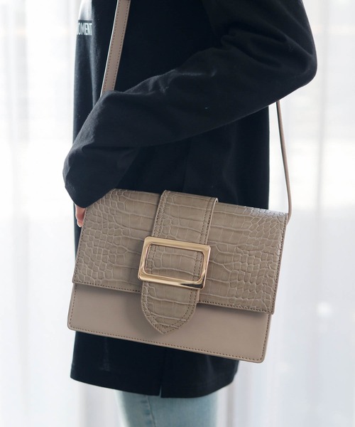かっちりとしたフォルムに、艶やかなスクエアバックルが上品に映えるショルダーバッグ。型押しデザインのフラップ使いがこなれた印象で存在感抜群。マチが広く、長財布や携帯といった必需品の収納にも困らないサイズ感も嬉しい。様々なスタイリングに合わせやすく、コーデのアクセントとして活躍するおすすめのアイテムです。