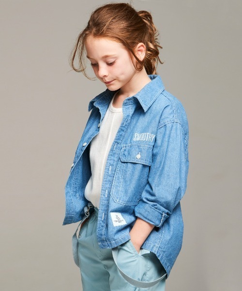 ※ モデル : 身長 119cm / 着用サイズ Mサイズ (120cm)シャンブレー生地を使用しましたビッグシルエット型のミリタリーシャツです。バイオブリーチ加工を施し、左胸にはロゴを染み込みプリントしました。1枚で羽織物にもインナーにも使える万能なシャツになっております。【サイズ目安】Sサイズ : 100cm 程度Mサイズ : 120cm 程度Lサイズ : 140cm 程度XLサイズ : 160cm 程度【SMOOTHY / スムージー】メンズブランドを12年間手掛けてきた品川雄一ディレクションによるキッズブランド。エグゼクティブディレクターには、現在スタイリストとして多くのメディアで活躍している菊池陽之介を迎え 、THE DRESS WRAPPED WITH DADDY'S LOVE TO YOU. 『パパが考えた愛情に包まれた子供服』というコンセプトに基づいて展開されています。普遍的なアメカジをベースにワークやトラッド、ミリタリーの要素を加えたスタイルを提案。