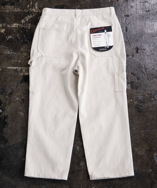 GLOBAL WORK×CANTONGLOBAL WORK×CANTONのオリジナルアイテム。ワークパンツをベースとしたカジュアル感のあるワイドシルエット。 CANTONが厳選した約12オンス、コットン100%キャントンファブリックを使用しています。 ペインターパンツをベースとしたワークディテールで、ややテーパーをかけカジュアル感ありつつもすっきりとしたシルエットに仕上げました。セットアップ展開のカバーオールと合わせるのがおススメですが、ルーズになり過ぎないキレイ目なインナーやアウターと合わせてキレイ目コーデのアクセントに使うのもおすすめです。