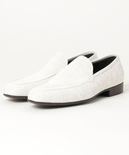 【パンチングレザー×プリント柄で夏の足元にひねりを効かせた1足】■HIGH STREET■<DESIGN>ハイストリート定番のスリッポンを夏向けにアレンジ。パンチングレザーにプリントを施し2重のアクセントを効かせたスリッポンです。木型は見た目のシャープさを重視しソフトスクエアトゥを採用。イタリア製のモールドソールを使用し、ソール側面は丸く削り、薄く見せるためにウェルトを巻いていないので見た目にも軽い印象が特徴です。同トーンでのせた程良いプリント感が心地よく、カジュアルなスタイリングから上品なスタイリングまで幅広くマッチする汎用性の高い一足です。<TEXTILE>オフはキップベロア・ネイビーはステアレザーと素材を変えています。パンチングレザーにプリントを施し、他にないインパクトのある見栄えに仕上げました。シンプルながらも独特の存在感があり、様々なスタイルに合わせやすいのも特徴です。同柄でベルト(632-0062001)も展開しています。ベルトとスリッポンのセットはセットアップスタイルやカジュアルのはずしに一押しのアイテムです。