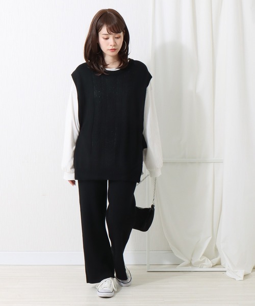 ニット素材のセットアップ。 前身ごろの立体感のあるケーブル編みで、すらっと細見え! スクエアシルエットでこなれ感たっぷりに仕上げています。 両脇にサイドリボンがアクセントになり、甘さをプラス。 セットのリブパンツは縦のラインを強調したシルエットは、 バランスがとりやすくスタイルアップにも◎ 旬のニットパンツで魅せる大人のスタイル完成です。 セットで合わせるのはもちろん、単体でもご利用頂けます。 シーンによって幅広いコーディネートを楽しめるのもポイント。 ニットベストをシャツやロンT、ワンピースの上から合わせてても◎ リブパンツは柔らかな質感で着心地バツグンの一枚。 ※屋外の光や照明の当たり具合、パソコンなどの閲覧環境によって実際の色味と異なって見える場合がございます。 予めご了承ください。