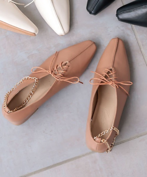 センターシームとレースアップデザインとゴールドのチェーンがクラシカルで、上品ながらも華やかなイメージに仕上がるフラットシューズ。ゴールドのチェーンは取り外し可能で、気分に合わせてシンプルな印象にもお使い頂けます。【素材・サイズ感】S~LLの4サイズ展開。高級感漂うスムースの展開で、オンオフ問わず大活躍のアイテムです。
