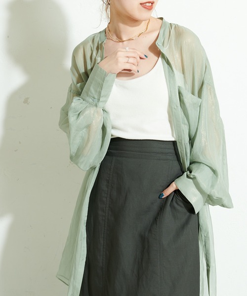 シアー素材が女性らしい印象のバンドカラーシャツ。スマートなバンドカラーに、ゆったりとしたシルエットが抜け感を演出。シアーな質感が女性らしく、トレンド感のあるスタイルを後押しします。サイドにあしらった深めのスリットが、シルエットに軽やかな動きをプラス。腰回りが隠れる長めの着丈は、スキニーパンツやリブパンツとも相性抜群◎一枚着はもちろん、軽い羽織としても重宝するアイテムです♪【STAFF着用コメント】本部 橋本(160cm)さりげないラメの入ったシアー素材が可愛い!かなり透け感のある素材なのでインナーを変えて春から夏まで使えそう◎着丈が長めなのも今っぽい!PRESS チバチャン(167cm)ラメシアー素材がかわいいバンドカラーシャツは袖ボリュームとビッグシルエットなので合わせるだけでトレンド感のある着こなしに♪***********************洗濯方法:手洗い裏地:なし透け感:あり伸縮性:なし光沢感:あり生地の厚さ:薄い***********************※ご覧のモニター環境や撮影環境により実際の商品と多少色味が異なって見える場合がございます。【お気に入り登録がオススメ】●商品のお気に入り登録「在庫残りわずか」の通知や、「完売カラーの再入荷」、「セール」の通知を受けることができます。●ブランドのお気に入り登録新商品や再入荷等、ブランドのお得な情報を受け取る事が出来ます。