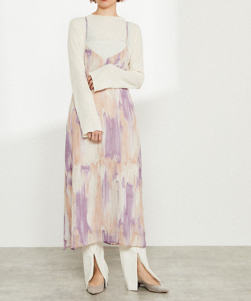 トレンド感満載のキャミソールワンピース。 明るめの配色のマーブル模様は、これからの季節にぴったりです。 長さ調整可能なストラップのバッククロスで、自分のバランスに変更可能。 フロントのVカットが女性らしい抜け感をプラスしてくれます。 インナー次第でコーディネートが変わり、シーズンレスに楽しめるアイテムです。