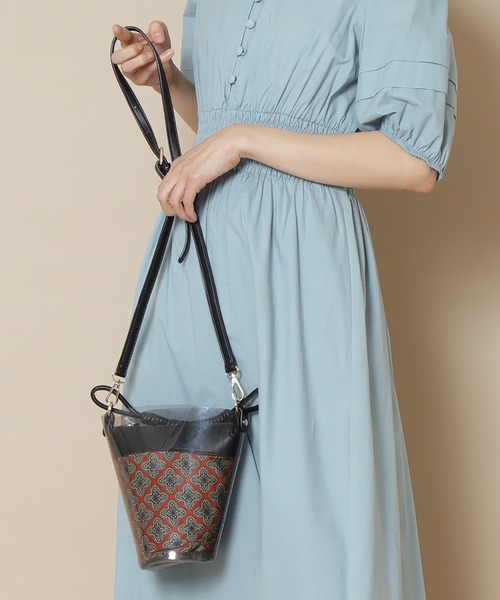 春夏スタイルのアクセントになる巻きハンドルバッグ。バケツ型が女性らしく、ひねりを加えたワンハンドルをポイントにしたデザインです。表は透明感のあるボディ、内側は総柄生地を組み合わせたシーズンライクなルックスが特徴。ファスナー式で収納を守り、開閉をスムーズに。取り外し可能なショルダーベルト付き。