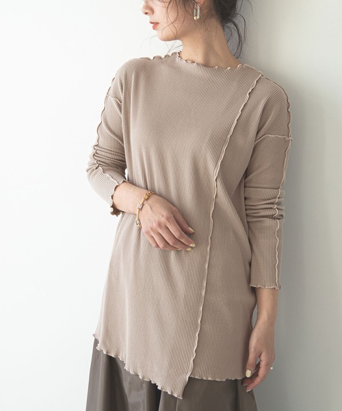 メロー×アウトシームがポイントのテレコリブカットソー ネック、裾、袖口の繊細なメローが女性らしさを引き立ててくれるカットソー。 フロントサイドはラップ風に切り替えており、イレヘムになった裾がアクセントに。 コットンベースの針抜きテレコリブは肌触りが良く、伸縮性と通気性にも優れているので、ストレスフリーな優しい着心地が特徴です。 程よく厚みのあるリブ素材なので下着のラインを拾いにくく、透け感も気になりにくいのも嬉しいポイント。 ゆったりしすぎない程良いサイズ感で、ラフさと女性らしさを兼ね備えた1枚です。 ヒップを覆うチュニック丈なので体型カバー効果も◎ レディライクにもメンズライクにも着られる万能アイテムです。 【コーディネート】 裾に特徴のあるデザインなので、アウトコーデがおすすめ。 ジャガードパンツやスラックスとの相性抜群です。 ********************** 透け感:なし オフホワイトは淡色のインナーをおすすめします。 裏地:なし 伸縮性:あり 光沢感:なし 生地の厚さ:普通 ********************** ※ご覧のモニター環境や撮影環境により実際の商品と多少色味が異なって見える場合がございます。 ご理解の程よろしくお願いいたします。 【お買い物をよりお楽しみいただく為に】 ▼商品のお気に入り登録をおすすめします ♡をクリックしてください。 完売カラーの再入荷や、ラスト1点の通知、 セールの際の通知を受ける事ができます。 ブランドのお気に入り登録もご一緒にお願い致します。