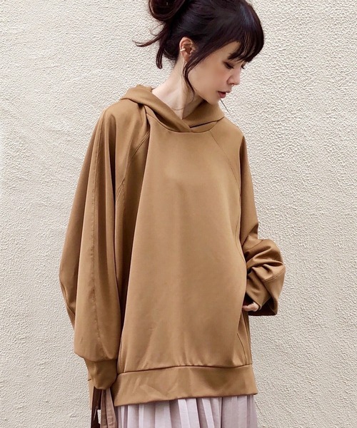 【洗濯機で洗える】【消臭効果】フーディトップスさり気ない切り替えで絶妙な立体感を出した、着用するだけでニュアンスのあるフーテッドトップス。ヒップまで隠れる着丈や胸と袖の間にゆとりがあるシルエットなのでストレスフリーな着心地です。顔まわりを覆うようなフードは立体感があり小顔効果もあります。柔らかくて軽い素材なので着心地よく、程よい表面のツヤがカジュアルになり過ぎない印象に仕上げています。縫製部分には、汗などのにおいの元となる成分を吸着消臭してくれる糸を使用。汗のにおいを軽減する効果が期待できます。洗濯機で洗うことができてお手入れも簡単。洗濯:洗濯機使用可(ネット使用)※取り扱いについては、商品についている品質表示タグでご確認ください。 ※着用での撮影画像は、光の当たり具合で色味が違って見える場合があります。商品の色味は、スタジオ撮影の画像もご確認ください。