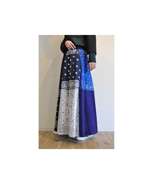 ユーズドのバンダナを贅沢にパッチワークで組み合わせたスカート。 ブルー、パープル、ブラック系統のカラーでまとめた深みのある色合い。 ウェストのリボンでサイズ調節可能。 ふんわりと広がる軽い穿き心地。 同シリーズのブラウスと合わせてワンピース風に着るのもおすすめ。 色違いにレッドあり。 *バンダナの組み合わせはアソートなので、柄や色など個体差があります。 ●商品一覧トップページはこちら↓ http://urx3.nu/LHHy