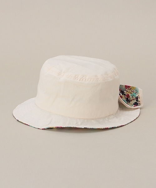 ワンカラー勝負のデザインがおしゃれさを印象づけるハットです。バックに束ねたリボンはボタンを外すと日よけになり、首後ろを日差しからカバー♪ ツバをくるんと折り返して、裏側の小花柄をチラ見せするとさらに可愛らしい雰囲気に。紛失防止に役立つあごヒモつきです。