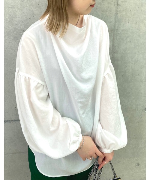 ナチュラルなシワ感とエアリーなタッチのカジュアルなブラウスボリュームのあるスリーブとドレープを施した衿元で女性らしいフォルムに仕上げました。ゆとりのあるボディと、スリーブのデザインでリラックスムード漂う雰囲気に。バックボタンディティールで後姿にもアクセントをプラス。ボタンを開けて抜け感を出した着こなしがおすすめです。前後差ヘムでバランスを軽くしているのでボトムを選ばず、コーディネートのポイントになってくれるアイテムです。・着用シーンを問わずシーズンレスで活躍する万能なアイテム・存在感があるアイテムなので、一枚で着映えする・ボリュームのある袖が今年らしいデザイン洗濯方法:手洗い透け感:なし裏地:なし伸縮性:なし生地の厚さ:普通光沢:ややあり【スタッフ着用コメント】《SAYAKA》身長:159cm/普通/普段サイズ:S/着用サイズ:Fサイズ感:全体的にゆとりがあり身体のラインを拾いません。素材感:ほとんど透け感がなく安心して着て頂けます。着心地:さらっとして楽に着用いただけます。前後差のある着丈でボトムを選びません。《Ami》身長:158㎝/細身/普段サイズ:S/着用サイズ:Fサイズ感:首も詰まりすぎず、程よく開くデザインなので暗いお色でも重たい印象になりません。身頃にボリュームがでないのですっきり着られます。素材感:ポリエステル100%でお洗濯後もそのまま着用できお手入れがラクです。着心地:ラクな着心地です。着るだけで映えるのでシンプルなデニム合わせなども素敵に見せられます。《yamaguchi》身長:158cm/普通/普段サイズ:M/着用サイズ: Fサイズ感:ふんわりとしたシルエットとサイズ感です。着丈は長すぎないのでインも出来ます。素材感:夏でも涼しくお使いいただける素材です。着心地:ゴワつきが無いのでストレスフリーにお過ごし頂けます。《kitaguchi》身長:160cm/普通/普段サイズ:M/着用サイズ:Fサイズ感:身体のラインをひろわないボリュームです。素材感:ザラっとしていてカジュアルな印象です。着心地:袖口のゴムもキツすぎないので楽に着ていただけます。==============================【注意点】※画像の商品は光の照射や角度、お使いのモニター環境により、 実物と色味が異なる場合がございます。 あらかじめご了承下さいませ。==============================【お買い物をもっと便利に楽しく♪】『♡』をクリックでお気に入り登録・「商品のお気に入り登録」で・・・ラスト1点や再入荷の通知が届きます。登録して頂いた商品だけが対象となる、あなただけのタイムセールが開催されることも!・「ブランドのお気に入り登録」で・・・新商品や再入荷など、いち早くブランドのお得な情報を受け取ることができますので、ご登録をおすすめします! ==============================
