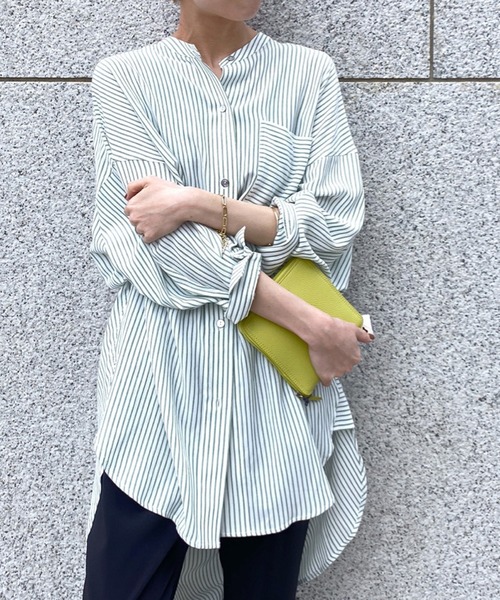 ビッグシルエットがこなれた印象のバンドカラーシャツ今年らしいクラシカルなムードが印象的な一枚。大きな胸ポケットもポイントで、間延びしがちな面積広めのデザインを引き締めます。前を開けて羽織としても着ていただけます。使い勝手の良いさわやかなミントや、着映えするバイオレットの春らしいカラー展開も◎リラックス感のある上品な大人カジュアルにも対応できる優秀アイテムです。・ソフトな風合いでノンストレスな着心地・オンオフ問わず着られるシャツは持っておくと便利なアイテム・スリーブのボリューム感がトレンドライクな一枚・さらりと着るだけで存在感がある着映えるストライプ柄シャツ洗濯方法:ドライクリーニング透け感:ややあり裏地:なし伸縮性:なし生地の厚さ:普通光沢:なし【スタッフ着用コメント】《Ami》身長:158㎝/細身/普通サイズ:S/着用サイズ:Fサイズ感:ゆったりとしていてボディラインがでないサイズ感です。素材感:さらっとしていてやわらかい素材でストレスなく着用頂けます。着心地:動きやすく楽な着心地。さらっとしていて夏も着用頂けます。《CHIKA》身長:157cm/普通/普通サイズ:M/着用サイズ:Fサイズ感 : 詰まり気味の襟と袖のボリューム感で布を纏ったようなふんわり感です。腰ほどの着丈なので程よいボリューム感で着用しやすいです。素材感 : 薄い生地で春夏らしい程よい透け感を楽しめます。ほんのり艶を感じる生地です。着心地 : 軽く、ゆったりしているので窮屈感もなく着用できます。《AI》身長:160cm/細身/普段サイズ:S/着用サイズ:Fサイズ感:身頃も袖もゆったりとしたオーバーシルエットです。素材感:落ち感があり自然にふんわりと動きがでます。着心地:肌触りが軽く夏でも快適です。==============================【注意点】※画像の商品は光の照射や角度、お使いのモニター環境により、 実物と色味が異なる場合がございます。 あらかじめご了承下さいませ。==============================【お買い物をもっと便利に楽しく♪】『♡』をクリックでお気に入り登録・「商品のお気に入り登録」で・・・ラスト1点や再入荷の通知が届きます。登録して頂いた商品だけが対象となる、あなただけのタイムセールが開催されることも!・「ブランドのお気に入り登録」で・・・新商品や再入荷など、いち早くブランドのお得な情報を受け取ることができますので、ご登録をおすすめします! ==============================