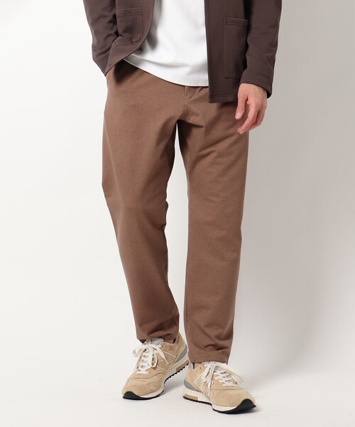 【デザイン】カジュアルからビジネスまで対応できる動きやすいテーパードパンツ。脇の継ぎ目を無くし、素材のストレッチ性を活かした快適な履き心地です。スピンドルは内側も隠せる2WAY仕様です。紐の先端がラバー加工されているのでチクチクしません。クライミングパンツのように入れた隠し股下ガゼットで、180°開脚が違和感なく可能です。逆ハの字型に入ったウエストダーツで、しゃがんだ時の動きにもフィット。シャツインスタイルでも裾が出にくいです。ウエストゴムは後ろの両サイドにのみ入れ、リラックス感のある履き心地できちんと見えをキープします。※ポケット数:横×2、後ろ×2【生地感】ジャージのような柔らかく、伸縮性のある素材です。※裏地なしこちらの商品は主に春に着用いただける商品です。モデル情報:身長181cm B90 W65 H90 着用サイズ:03(L)店舗へのお問い合わせ商品番号:616-72667●製品寸法:01(S):W~74cm H100cm 股下68cm 前股上25cm 渡り幅32cm 裾幅17cm02(M):W~78cm H103cm 股下69cm 前股上25cm 渡り幅33cm 裾幅17cm03(L):W~82cm H106cm 股下70cm 前股上26cm 渡り幅34cm 裾幅17cm04(LL):W~86cm H109cm 股下72cm 前股上27cm 渡り幅35cm 裾幅18cm05(3L):W~90cm H112cm 股下74cm 前股上28cm 渡り幅36cm 裾幅18cm備考: