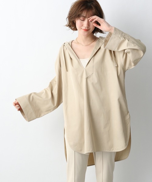 【デザインと特徴】フードから続いて深くV字に開いたフロントのデザインが特徴のメキシカンパーカー。長めの着丈や広めの袖口などバサっと着ていただけてゆるいシルエットが可愛いアイテムです。中にカットソーやシャツ、まだ寒いときにはタートルネックなどのインナーをレイヤードして着回しを楽しめます。着丈が長いのですっきりしたパンツやスカート合わせがおすすめです。同じ素材で「サイドポケタイトマキシスカート」もご用意しているのでセットアップにして着こなしてもおすすめです。 【素材特徴】少し光沢のある綿ビスコースという素材を使用しています。 綿特有の張りと、ツルっとしたタッチが大人っぽく女性らしい雰囲気です。【洗濯可否】ドライクリーニングでの処理が行えます。