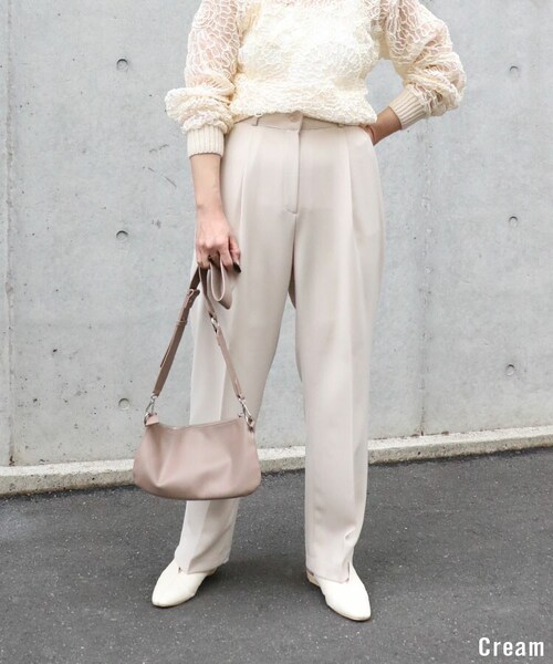 商品名:Sheson(シーズン)カラータックパンツ 商品番号:210118-47 商品説明:【2021SS】 ・落ち感が美しいテーパードシルエット ・程よいハリ感 しなやかな肌触りと落ち感が美しいテーパードシルエットのカラータックパンツ。 ウエストのタックでイージーな履き心地ながら美しいシルエットを実現。 オフィススタイルからオフまでシーンを選ばず、コーディネートの幅が広がるアイテム。 *商品画像のお色は撮影環境やモニターによって、 実物と若干異なる場合がございます。 *他のサイトと在庫を共有している為、ご注文頂いた商品が欠品となる場合もございます。 ------------------------------------------------------------------------- サイズ:フリーサイズ(モデル155cm-CR,PU/160cm-PU,BK) 平置き・実寸: ・ウエスト 31cm ・ヒップ 54cm ・股下 66cm ・総丈 97.5 cm ※個体によって若干異なる場合がございます。 **生地詳細** 【裏地】なし【生地の伸縮】なし【生地の透け感】なし(クリームは響かないインナーをお勧めします) **洗濯表示** ドライクリーニング 素材:ポリエステル85%,レーヨン10%,ポリウレタン5% 製造:韓国 カラー:クリーム・パープル・ブラック