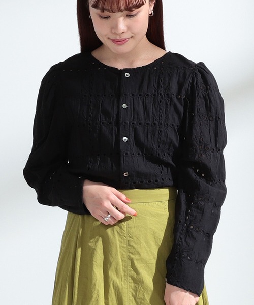 オンオフで着たいブラウスカットワーク刺繍が女性らしさをプラスする、クロップド丈のブラウス。パワーショルダーから袖口にかけて細くなるシルエットが、上品な印象の1着です。後ろ見頃はボタン開きデザインなので、前後逆にして羽織感覚でも着用可能。コンパクトなサイズ感なので、サロペットなどのインナーにもおすすめです。※強い力が加わると縫い目が開いたり、目寄れを起こすことがあります。着用時に引っ掛かりなどにご注意ください。WHITE Model:H168 (cm) Size:ONE SIZEBLACK STAFF Model:H162 (cm) Size:ONE SIZE