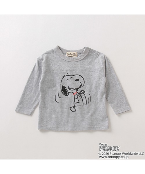 大笑いするスヌーピーの姿を描いたPEANUTSとのコラボTシャツです。バックにもユニークなプリントをあしらって、見る人がほほえましくなるルックスに♪ やわらかなコットン素材で着心地が良く、おでかけ時も心地よく過ごせます。※80、90サイズのみ肩開き
