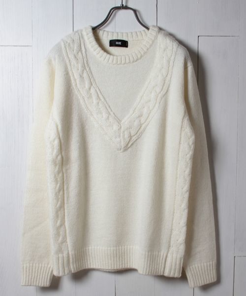 ネック部分と脇下部分にケーブル編みでワンポイントにアクセントを出したデザインニット。 モヘヤ混の糸で編んでいるので滑らかで柔らかく、上品な印象に仕上げたアイテムです。 またニット全体にボリューム感を出し、秋冬らしいウォーム感を表現しました! デザインニットなので秋口には1枚着としても使え、冬場はチェスターコート等のVラインが際立つアウターを着てもさり気無くケーブル編み部分がワンポイントとして映えるニットです。 ※店舗、WEBで在庫をお探しの際は下記の商品番号をお申し付け下さい。 商品番号→【553861】