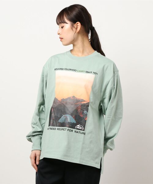 CAMP7らしいフォトが特徴のロングスリーブT。袖にボリュームを持たせているので、女性らしいシルエットに。ゆったりとしたオーバーシルエットですが、着丈が長すぎないのですっきり着用できます。カラーによってそれぞれ異なるフォトがプリントされているので価値観もアップ。アウトドアシーンであったらうれしい、抗菌防臭機能付き。