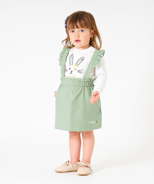 フリルつきのサスペンダーがキュートさを印象づけるスカートです。着脱も簡単にでき、プレーンなスカートとしてもデイリーコーデを盛り上げます。ブランドロゴとチェリーの甘いアクセントで、女の子らしさをプッシュ♪ ウエストはアジャスターゴムでサイズ調節可能です。両側にポケットつき。