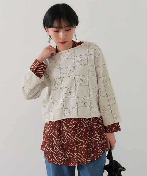 ショート丈の透かし編みニット。Tシャツや柄シャツとのレイヤードが映える一着です!【STYLING】Tシャツやアニマルなどの柄シャツはもちろん、人気のシアータートルとの相性も抜群です!同素材のニットパンツ(ブランド品番44095)とセットでの着用もおすすめです。【DETAIL】透かし編みが特徴の春ニット。首元はボートネックで女性らしさをプラス。ショート丈で袖も短めなのでインナーが映える一枚です!※店頭及び屋外での撮影画像は、光の当たり具合で色味が違って見える場合があります。 商品の色味は、スタジオ撮影の商品画像をご参照ください。※撮影場所やお使いのモニター環境により若干お色味が異なる場合がございます。