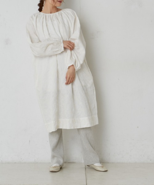 ピュアルセシン 2021 Spring collection 【Effortless garden】 ピュアルらしさでもある天然繊維の素材感、丁寧な生活の中に取り入れてほしい着心地心弾むファッションを続けていけるように地球の恵みをテーマに変わりゆく時代にあったSSの提案 ◇エアリーなボタニカル刺繍ワンピース◇ ピュアルセシンオリジナルの ボタニカルモチーフを刺繍したファブリックシリーズ。 素朴な綿麻素材をベースに、沢山の草花柄を生地と同色の糸で刺繍することで さりげない上品さを演出できるワンピースです。 クルーネックの首元にギャザーが、顔まわりに華やかさを添えてくれます。 後ろリボンがアクセントになり、バックスタイルもぬかりなく。 袖口はふんわりとしたボリュームシルエット。 エアリーな着心地で春らしく着て頂けます。 袖付けはラグランなので肩周りはゆとりがあり、インナーも重ねやすいサイジングです。 低身長の方は1枚でソックス等で足元とのコーディネートを楽しんで頂けます。 定番のデニム合わせでカジュアルダウンした着こなしや トレンドのリブレギンス等を合わせたりと着回し力も抜群なアイテムです。 ・オリジナルのボタニカル刺繍 ・ナチュラルで優しい印象 ・背中のリボンが大人可愛い ・ラグランスリーブでゆったりしたサイジング ・ボトムス合わせが楽しめる丈感 透け感:シロややあり 裏地:なし 伸縮性:なし 光沢感:なし 生地の厚さ:普通 【スタッフコメント】 年齢:30代後半/身長:154cm/普段着用サイズ:Mサイズ サイズ感: 肩周りがゆったりしていて着やすいです。しっかりインナーを重ねられるサイズ感です。 ギャザーが寄せられていますが、身頃はストンとしているのでお花の刺繍がしっかり見えます。 素材感:綿麻のナチュラルな質感 ※撮影場所やお使いのモニター環境により若干お色味が異なる場合がございます。特にロケの撮影では明るく見える傾向にございます。 ※予約商品はサンプルで撮影をしております。若干の仕様が変更になる場合がございますので予めご了承の上ご注文くださいますようお願いいたします。