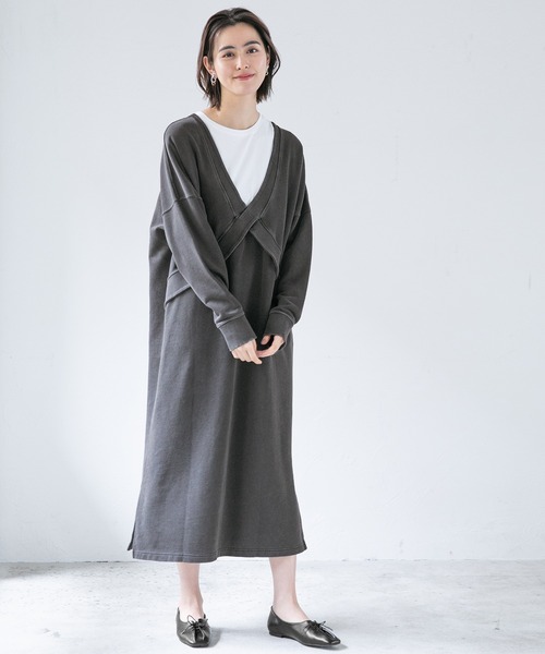 ビンテージ加工がこなれた印象に見せてくれるワンピース 洗いの加工でビンテージ感のあるカットソーを使用。カジュアルになりすぎないように、色味を大人な印象に仕上げました。前後どちらでも着用できるので、気分に合わせたスタリングが可能!深めのVネックを後ろにして、背中見せをすると女性らしさとカジュアルさがミックスされておすすめです。 ※こちらの商品は同素材のカットソーもご用意しています。 商品名:ビンテージライクプルオーバー 商品コード:5616544 ブランド品番:930068
