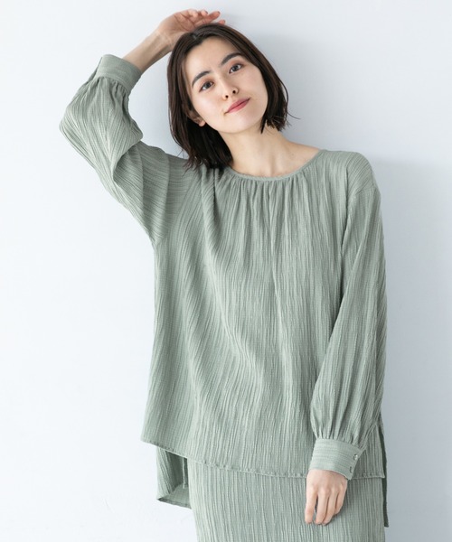 細かいシャーリングが女性らしいギャザーブラウス落ち感のある素材にシャーリングを施し、シンプルながら表面感のある1枚に。今期トレンドのギャザーの入った袖口が、女性らしい雰囲気に仕上げてくれます。バックの着丈は長めなのでスカートでもパンツでもボトムを選ばずに着ていただけます。キレイめな印象ですが、ストレッチが効いているので動きやすいのも嬉しいポイント◎※こちらの商品は、セットアップで着れるスカートもご用意しています。一緒に着れば、ワンピースのような雰囲気でより上品な印象に仕上がります。商品名:シャーリングナロースカート商品コード:55773847ブランド品番:932982