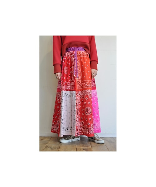 ユーズドのバンダナを贅沢にパッチワークで組み合わせたスカート。 レッド、ピンク、オレンジ系統のカラーでまとめた華やかな色合い。 ウェストのリボンでサイズ調節可能。 ふんわりと広がる軽い穿き心地。 同シリーズのブラウスと合わせてワンピース風に着るのもおすすめ。 色違いにブルーあり。 *バンダナの組み合わせはアソートなので、柄や色など個体差があります。 ●商品一覧トップページはこちら↓ http://urx3.nu/LHHy