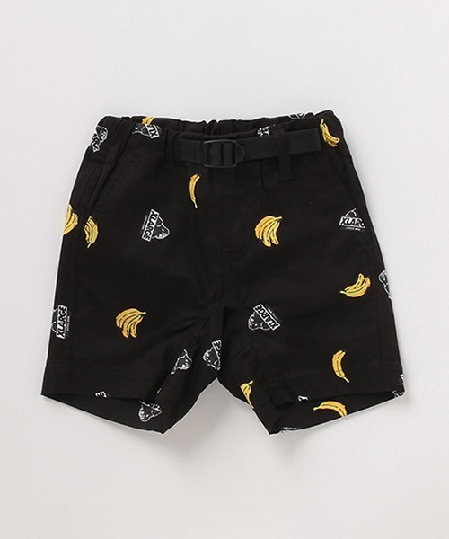 バナナとOGゴリラをコラージュしてインパクトのあるルックスに仕上げたショートパンツです。風合いやベルト飾りがワークテイストをただよわせ、遊びだけでなく大人顔負けの雰囲気も。シンプルコーデの盛り上げ役としても重宝するアイテムです。両側にポケットをセット。ウエストはアジャスターゴムでサイズ調節が行えます。内側にはお名前を記入できるタグつきです。