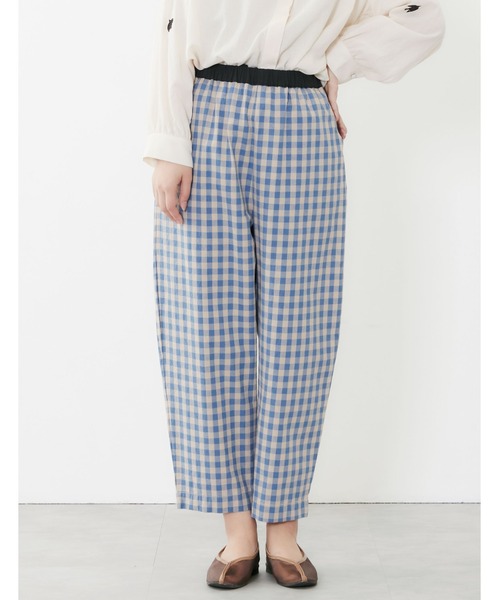 オリジナルカラーのギンガムチェックと着まわしの効くブラック無地で仕立てたイージーパンツ。ヒップ周りにはゆとりがあり、裾は程よくすっきりさせた人気のコクーン型のシルエット。ウエストはゴムとひもが入っていて履きやすさも魅力です。シンプルなトップスを合わせてメリハリを利かせたコーディネートがオススメ。両サイドポケット付き。