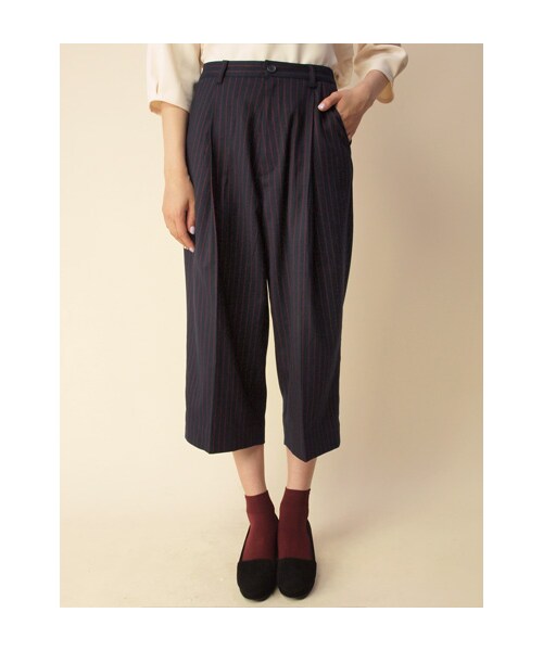 センタープレスの入った優等生なルックスのワイドタックパンツ。足首が見える7分丈のデザインで、ヒールで大人っぽくも、ローファーでトラッドにまとめてもOKな優秀アイテムです。※ウエスト後ろ部分はゴムになります。