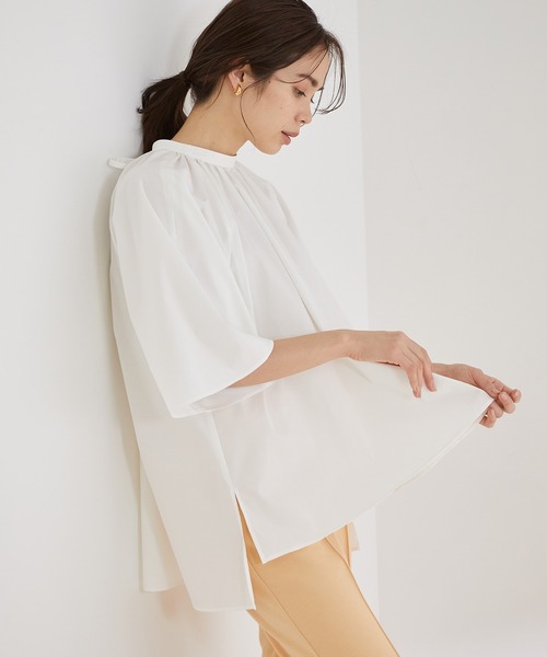スタンドカラーとギャザーがポイント!クールモダンフェミニンなブラウス【素材】コットンポリエステルのタイプライターは、合繊タッチの張りのある仕上げをした素材を使用。従来の綿のタイプライターよりもモダンな印象に。【デザイン・シルエット】ハイネックのボリュームブラウスは袖も太く体離れの良いテントライン。ネックからバックにかけてギャザーをフンダンにいれたキッチュなフェミニティが今シーズンの気分。バックデザインがポイント。ステッチワークもアクセントに。【カラー】ニュアンスカラーのキャメルとグレー、白のクールなカラーの3色展開。【おすすめのスタイリング】リブパンツやイージースラックス、細みパンツ合わせがお勧めです。リラックススタイル×フェミニン、マニッシュスタイル×フェミニンを楽しんで!----------------------------透け感:なし裏地:なし伸縮性:なし光沢感:なし生地の厚さ:中肉ポケット:なし洗濯方法:洗濯機可----------------------------【モデル情報】モデル身長:167cm 着用サイズ:38※画像の商品はサンプルです。 実際の商品と仕様、加工、サイズが若干異なる場合がございます。※室外で撮影している画像は、光の影響で色味が若干異なって見える場合がございます。※商品の入荷状況は、店舗までお問い合わせをお願いいたします。店舗での商品のお取り扱いについてROPE'の商品は、ROPE'実店舗のみの取り扱いになります。