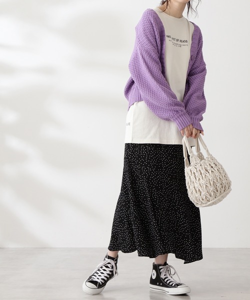 歩くと揺れる軽やかな裾のフレア感がフェミニンなペプラムロングスカート。柔らかい素材ですとんと落ち感があり、腰まわりがすっきりとしたロング丈のシルエットです。細かいドット柄やニュアンスカラーがアクセントになり、トップスにシンプルなスウェットやニット、カットソーとも合わせやすいです。ウエスト前をすっきり、後ろはゴムなので前だけトップスインも綺麗に決まります。