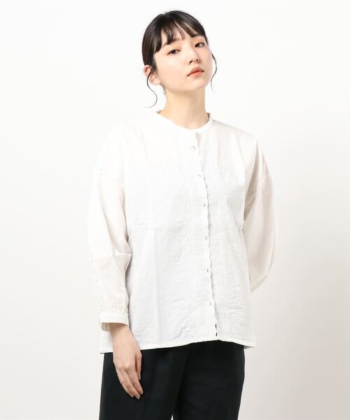 前立てのスカラップ刺繍が愛らしい表情をプラスする、大人可愛いブラウス。上品な印象を与えてくれるクラシカルなバンドカラーもポイント◎ふっくらとしたボリュームのあるスリーブも女性らしい印象を演出してくれます。コットンリネンのナチュラルな風合いで着心地も良く、デイリーの愛用率も高まりそうなアイテムです。