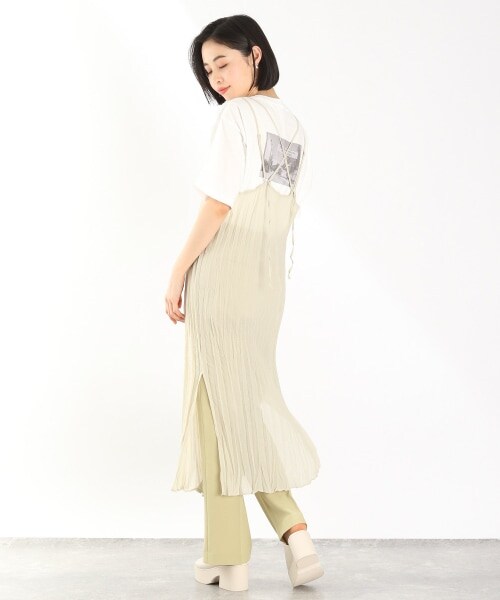 トレンドの透け感のある生地にプリーツ加工を施したキャミワンピース。プリーツの縦見えするラインでスタイルアップしつつ体系カバーもしていただけるレイヤードに使えるワンピースです。プリントTや無地のカットソーと柄のパンツ、スリットパンツと合わせて着こなすのがお勧めです。