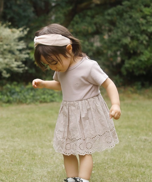 スカート部はこだわりのスカラップレース/本体は着せやすくて動きやすいストレッチテレコ素材/背中のスナップボタンが着せやすさをアップ