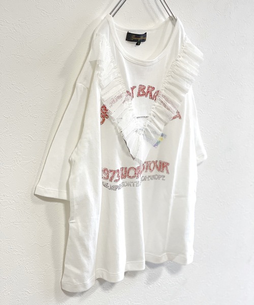 【Granny Branket】☆バンドTにフロントのフリルが可愛い!!甘辛トップス☆2020春夏に大人気のトップスが、2021春夏にも登場です!!バンドT風のプリントにフリル♪♪甘辛なトップス!!!スカートとコーデして、ガーリーにするも◎パンツとコーデして、ボーイッシュも◎どんなコーデにもバッチリなトップスです!カラーはオフホワイト・ブラックの二色展開☆※こちらの商品は、ジュニア~大人のサイズとなっております。 サイズ表をお確かめの上、お買い求めくださいませ。