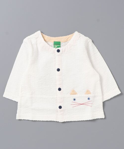 ネコのお顔モチーフがアクセントになったカーディガン。デコボコとした清涼感のあるサッカー天竺素材はお肌に張り付かず、日除けや冷房対策に活躍します。通気性の良い綿100%で汗っかきの赤ちゃんにも安心の素材です。 【RAGMART/ラグマート】 シンプル&ナチュラルなテイストに、心をくすぐる小技の効いたディテールや大人な配色が個性を感じさせるブランドです。 洗濯にも強く、型崩れせず丈夫なので、安心して着て頂ける商品が充実しています。 種類も豊富で、シャツやブラウス、ジャケットやコート、パンツ、スカート、ワンピースなど ひと手間かけたさりげないデザインが特徴です。 [サイズ展開] 新生児:70㎝~80㎝ BABY :70㎝~95㎝ KIDS :100㎝~130㎝