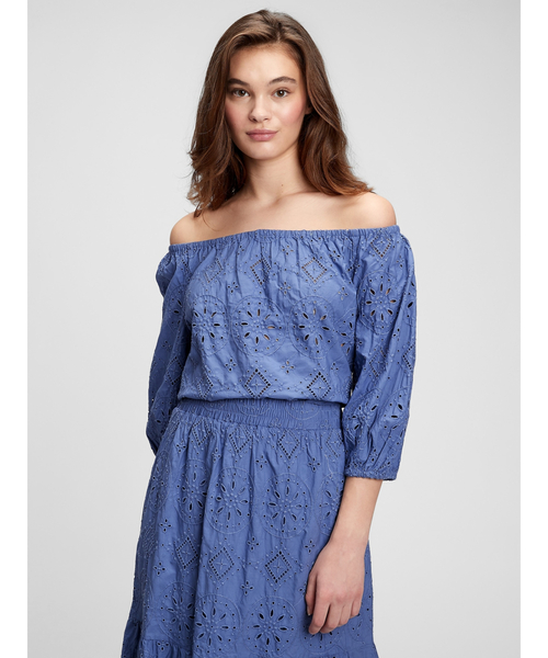 滑らかなポプリン生地 肩出しオフショルダー 七分袖 全体にアイレットのディテールストレートシルエット、リラックスフィット 腰あたりまでの丈 *商品タグに記載の価格とサイト上の販売価格が異なる事があります。