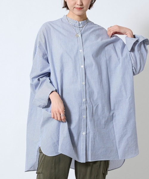 \シーズンムードをまとった爽やかなストライプブラウス/ 洗練されたイメージをプラスしてくれる、クラッシックな印象のデザイン。清涼感のある、爽やかな配色がポイントです。程よくハリ感のある素材にたっぷりと分量を取ったオーバーシルエットで1枚でも存在感のあるスタイリングに。ヒップも隠れる前後差あるチュニック丈で、体型カバーもばっちり叶えてくれます◎デニムやリブパンツなど、どんなシルエットのパンツともバランスよくコーディネートが決まる1着です。ニットやスウェットとレイヤードして、裾からちらっとシャツを覗かせたスタイリングもオススメですよ♪ ********************* ・クリーンな印象のデザイン ・たっぷりと分量を取ったオーバーシルエット ・体系カバーも叶えるチュニック丈 ********************* 【 ♥ をクリックでお得な情報をお知らせいたします 】 〈 商品のお気に入り登録 〉 お気に入りアイテムのお値下げ・再入荷・在庫ラスト1点など通知を受けることができます。 〈 ブランドのお気に入り登録 〉 DOUDOUの新商品や再入荷、セール、クーポン配布などお得な情報を受けることができます。 -------------------------------------- ※ 掲載画像の商品の色味は、 撮影場所や光の当たり具合などにより色味が異なって見える場合がございます。 また、お客様のお使いのPC・スマートフォン等のモニター環境などにより色味が異なって見える場合がございます。予めご了承の上ご注文ください。 ※着用、お取り扱いの際は、商品についている品質表示とアテンションタグを必ずご確認下さい。