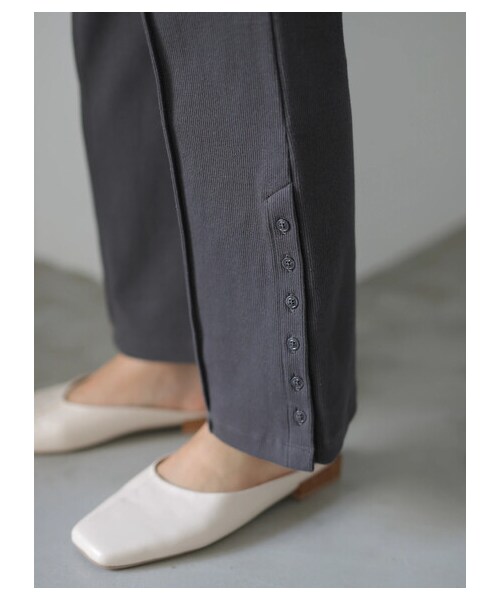 裾のサイドボタンがアクセントになったリブパンツ。 センターのピンタックが縦ラインを強調し、シルエットをすっきりと見せてくれます。 ウエストゴム仕様なのでフィット感もよく、穿き心地もノンストレスです。 チュニックやワンピースとのレイヤードコーデなど、様々なスタイリングが楽しめるアイテム。
